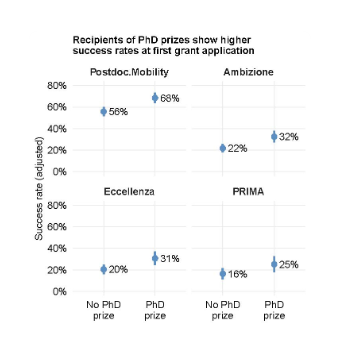 Overall, 27% of CTC applicants received a prize for their dissertation. The proportion was similar for men (28%) and women (27%), and also comparable across research domains: 26% in the humanities and social sciences, and 28% in both mathematics, natural and engineering sciences, and biology and medicine.