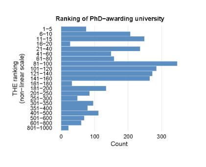 CTC collected the THE World University Ranking of the PhD-granting institution at the time of PhD obtention, as information on the environment in which the PhD was received. A logistic regression analysis shows that the ranking of the PhD–awarding university, on its own, does not differentiate successful from unsuccessful application.